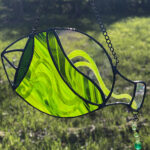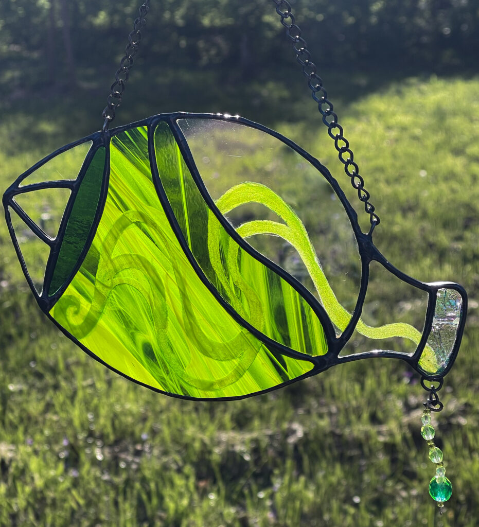 Hand painted stained glass sun-catcher – UV reactive glow-in-the-dark paint, uranium glass bead droplet