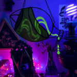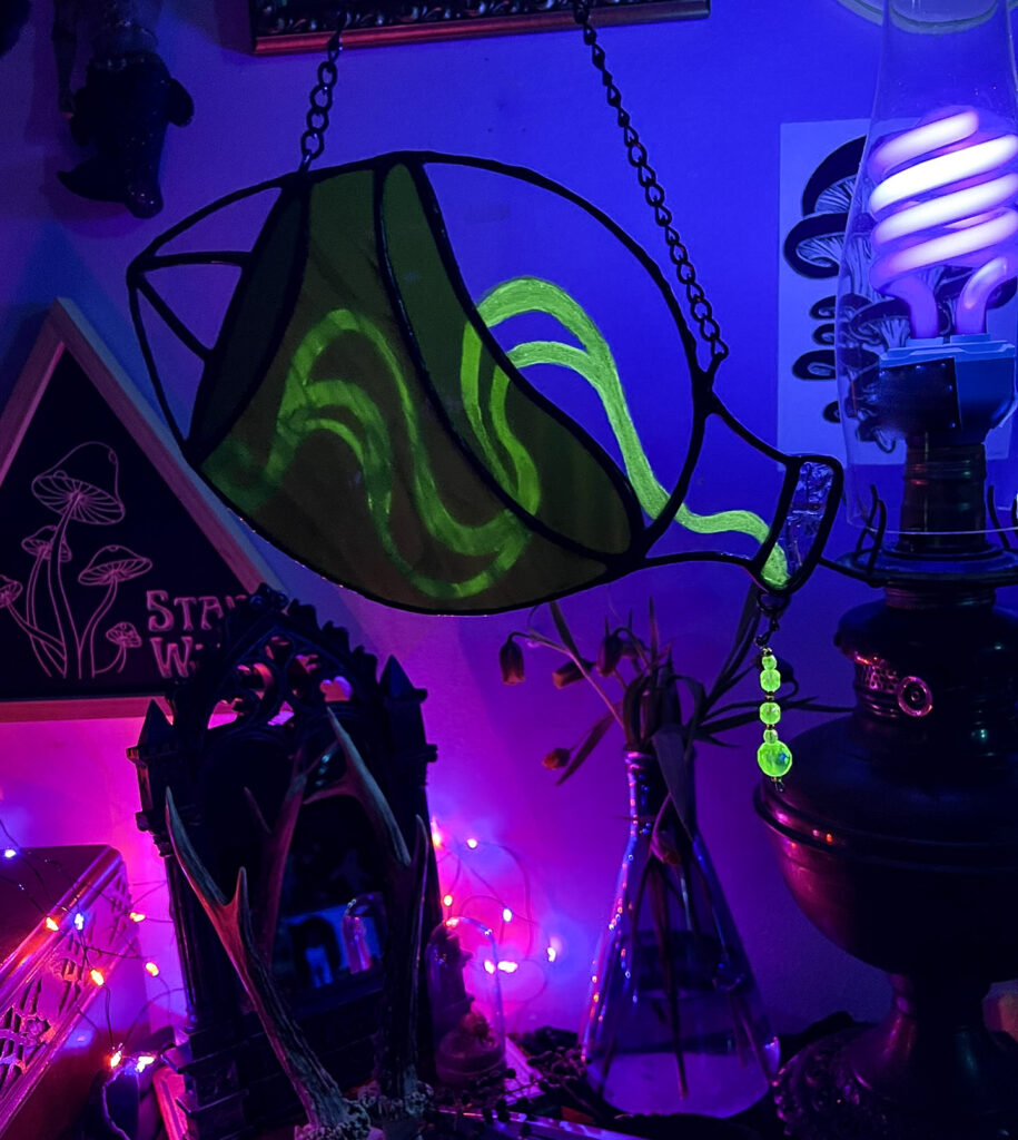 I wanted to make a sun catcher that looks just as cool when the sun goes down. I experimented with different materials on this one, milling my own enamel paint with UV/glow pigments and alcohol ink. This piece is perfect for that unhinged alchemist lab vibe, or just… for a cool space. Look how shiny and glow-y!