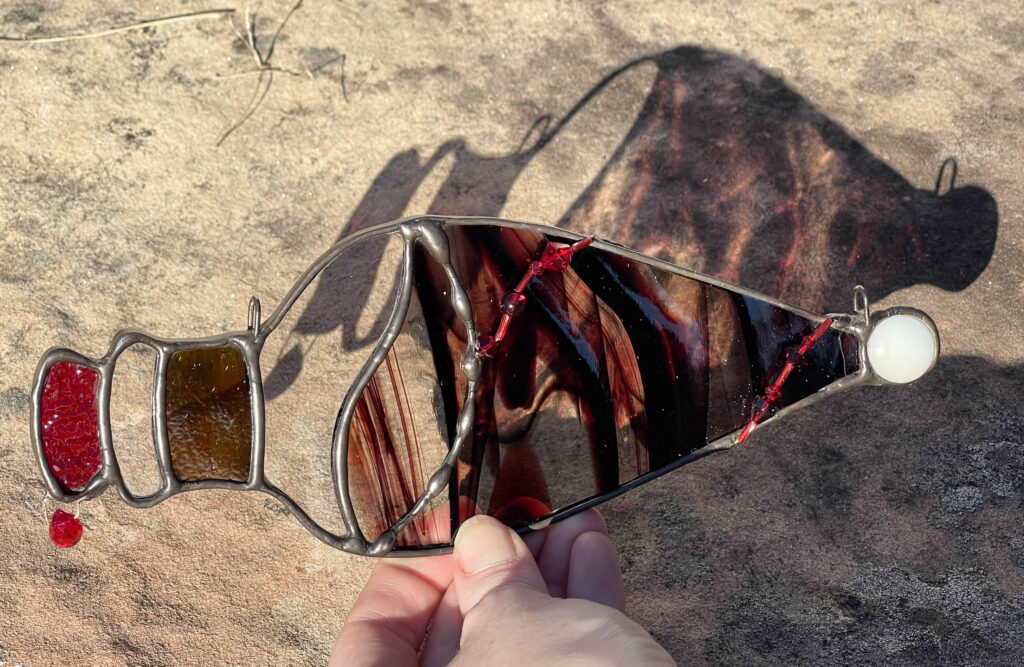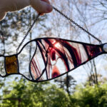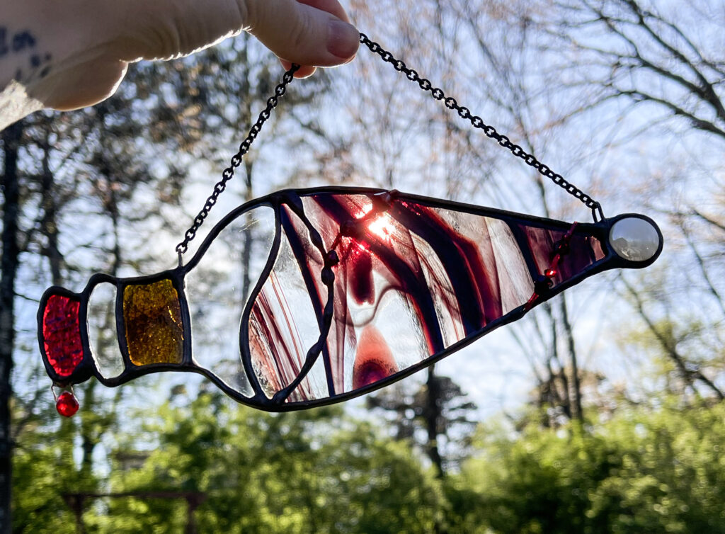 These beautiful blood red swirls in clear glass immediately made me think of macro photos of ink dropped in water. I was inspired by the shape of Victorian “tear vials” (which is a myth- they were actually just scent vials, TBH) and the Bloodborne ‘blood vials’, of course. The vampy, gothic vibe just created itself, really. Not to mention the unreal glow of the reds in the sun. Hang it in your parlor, unsettle your guests. Profit?